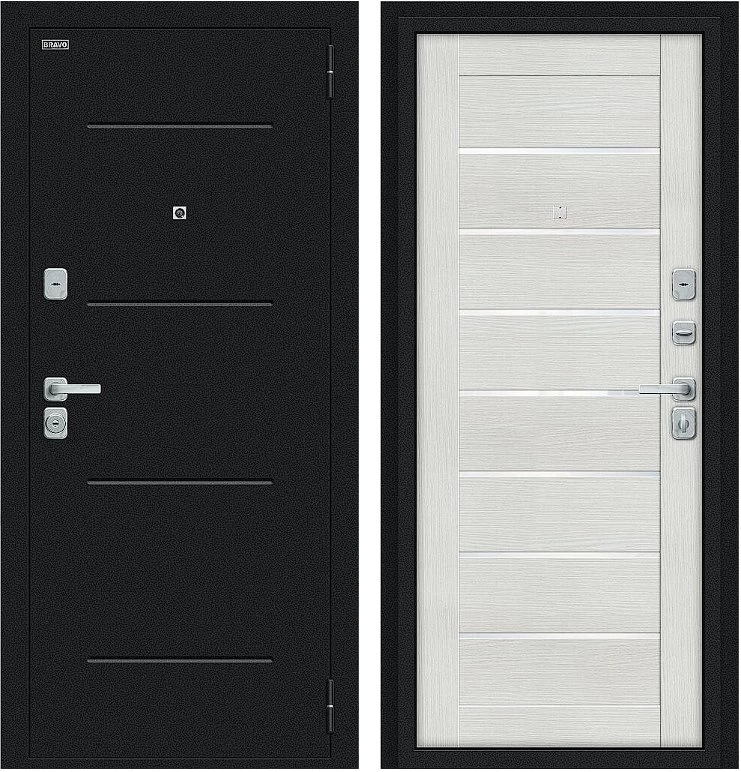 Надежная входная Дверь Браво Техно/BChrome Букле черное/Bianco Melinga премиум класса по цене 30 500 руб. Большая толщина стали защитит от проникновения в ваш дом, квартиру или коттедж. Используется очень качественная фурнитура: замки, цилиндры, ручки, защелки. Покрытие и отделка двери изготовлено под внимательным контролем производителя. Дверь имеет долгий срок службы и гарантию.